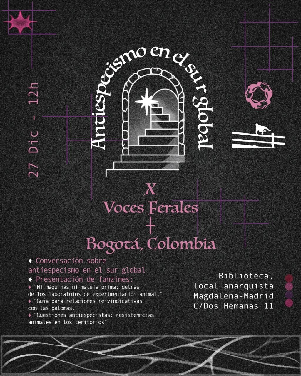 Desde Colombia, el sábado 27 de diciembre a las 12h, recibimos a las compañeras de Voces ferales que vendrán a conversar sobre el antiespecismo en el sur global y a crear nuevas alianzas.