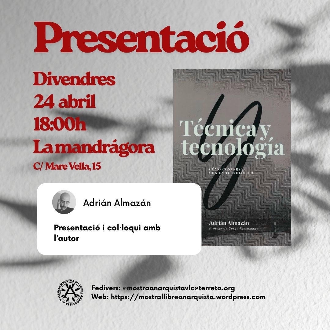 https://calendari.cc/event/presentacio-del-llibre-tecnica-y-tecnologia-como-conversar-con-un-tecnofiloC/Mare Vella, 15 Bajo Izquierda, 46020