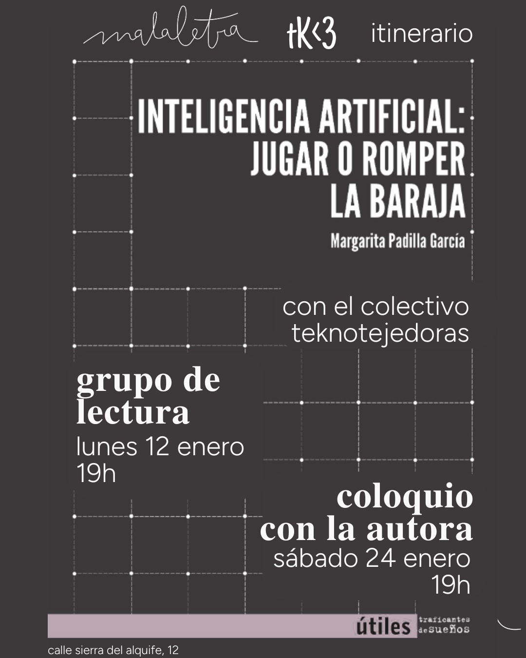 ✨ya vienen ya vienen las actividades para el 2026 (!!!) empezamos el curso con las compiis de teknotejedoras (🌸) para leer juntas el libro de margarita padilla sobre inteligencia artificial,,,, dos fechas para leer y debatir en torno a preguntas como: ¿qué sería una inteligencia artificial radical? O mejor dicho, ¿cómo sería una relación radical con la inteligencia artificial? ¿es posible acaso volver a sentir la alegría hacker por la potencia de actuar, de subvertir, de crear? ¿cómo hacerlo?